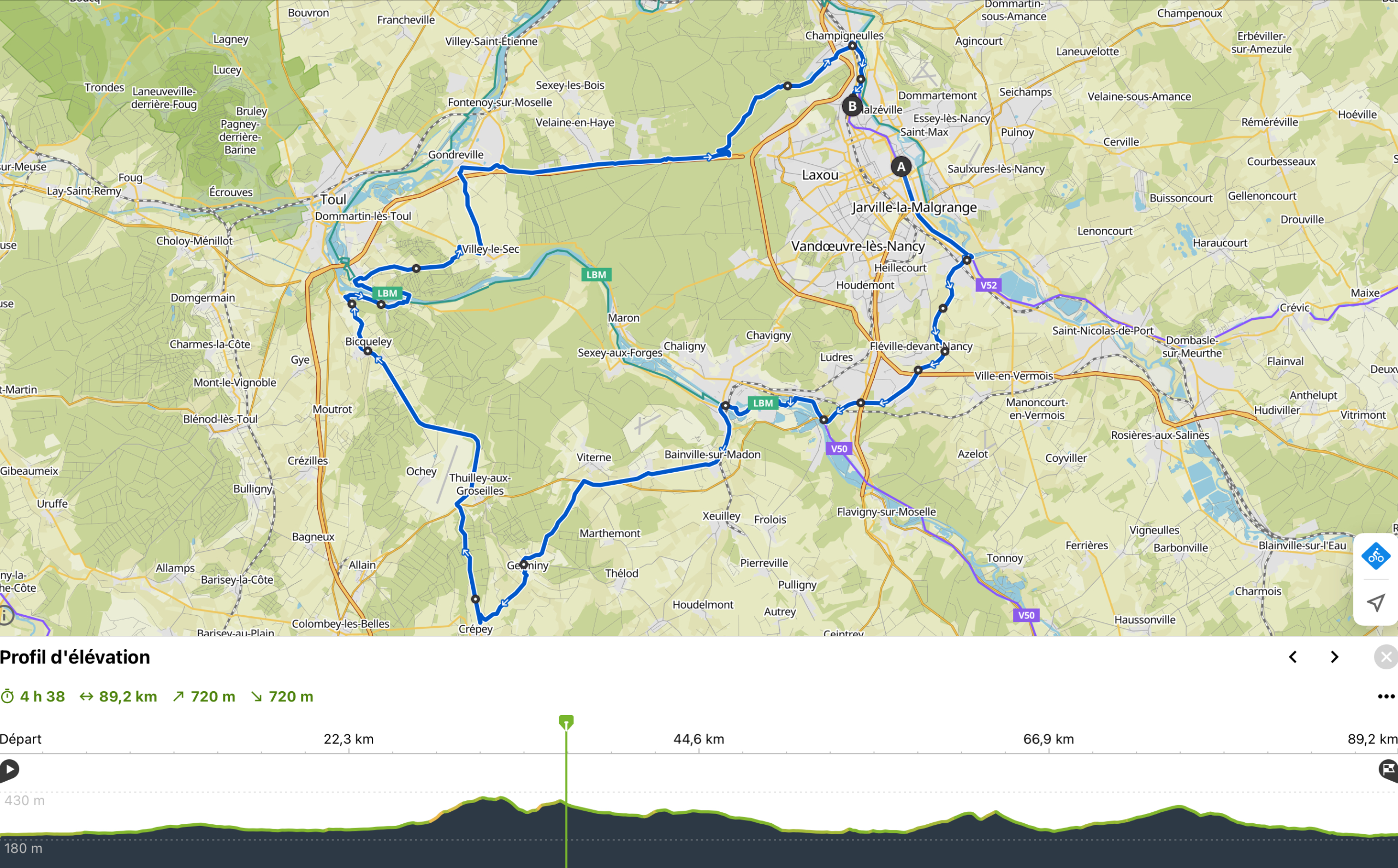Kinépolis, piste canal, Laneuveville-devant-Nancy, piste Canal LBM (les boucles de la Moselle) Laneuveville-devant-Nancy, Messein, Pont-st-Vincent, D974, Blainville-sur-Madon, Maizières, D974 à gauche, D124, Germiny, Crépey à droite, D904, Bicqueley, D904 à droite, D121, Pierre-la-Treiche à gauche et traverser la Moselle, LBM, Chaudeney-sur-Moselle, route forestière rejoindre D909 et prendre à droite, D909 (Villey-le-Sec) à gauche, Gondreville à droite, D400, Poste de Velaine, D400, Les Baraques à gauche, Champigneulles, Piste Meurthe, Le Pont Fleuri.