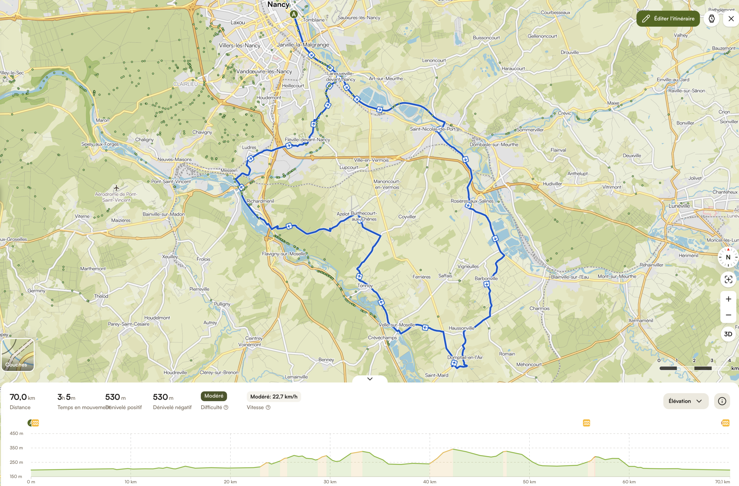 • Variante possible sans la bo-bosse de Ludres (69 km, 480 m) :