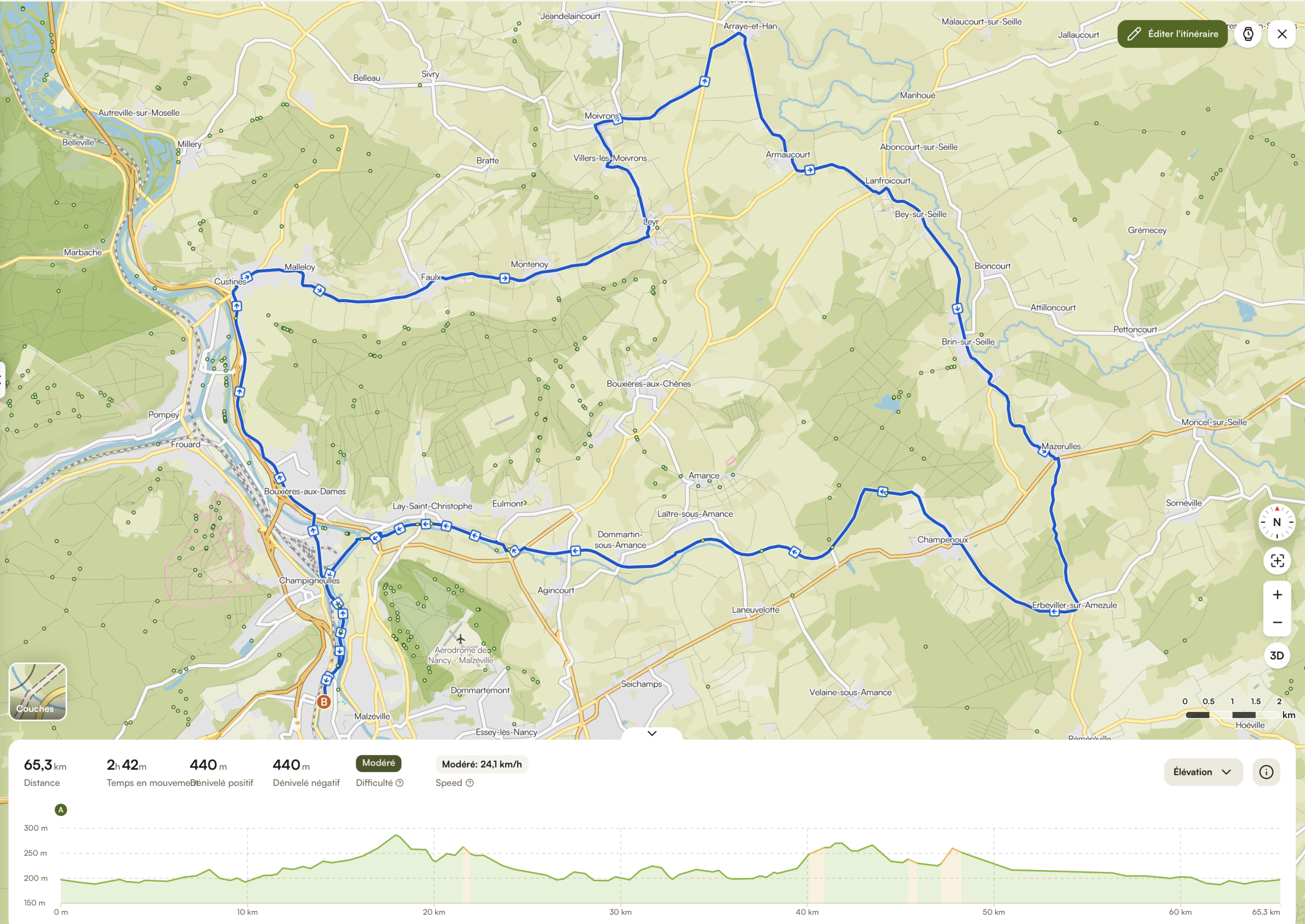 Le Pont Fleuri, piste Meurthe, les Brasseries à gauche, D40 , Bouxières-aux-Dames, D40, Custines à droite, D90, Malleloy, D90, Faulx, D90, Leyr à gauche, D90F, Villers-lès-Moivrons, D90F, Moivrons à droite, D10, D10 à gauche, D913 direction Nomeny puis à droite CC, Arraye-et-Han à droite, D70, Armaucourt, D70, Lanfroicourt à gauche puis à droite, D70, Bey-sur-Seille, D70, Brin-sur-Seille à gauche, D70H, Mazerulles gauche-droite, CC, Erbéviller-sur-Amezule, D70, Champenoux tout droit, INRA-Arboretum à gauche, voie verte puis à gauche voie verte de l’Amezule, passerelle du Moulin-Noir à gauche, piste Meurthe, Le Pont Fleuri.