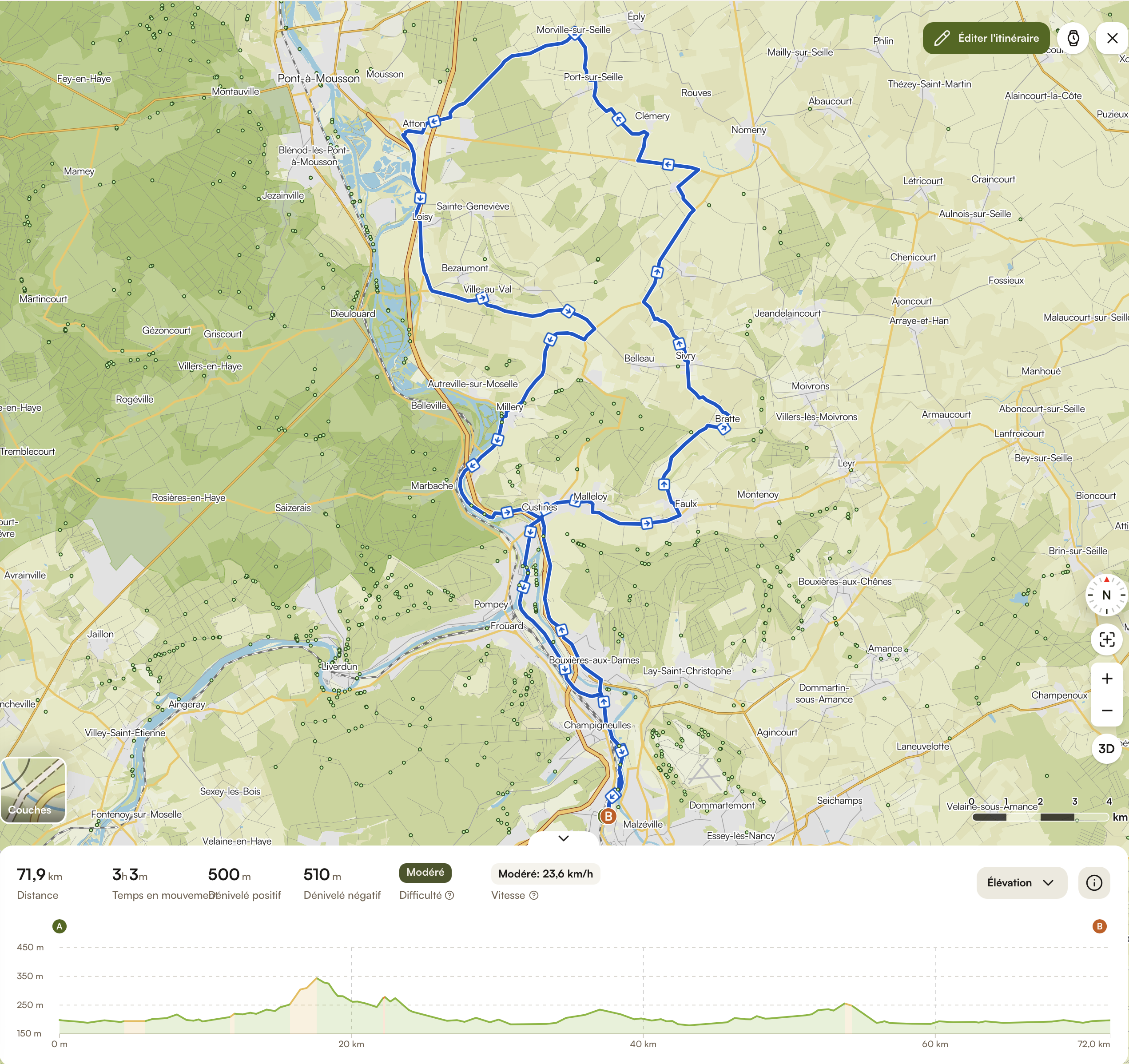 Le Pont Fleuri, piste Meurthe, Les Brasseries, D40, Bouxières-aux-Dames à gauche, D40, Custines à droite, D90, Malleloy, D90, Faulx à gauche, D90E, Bratte, D90E, Sivry tout droit, CC, Serrières, D44B, D44B à droite, D44, D44 à gauche, Manoncourt-sur-seille, D120b à gauche, D120, Les Quatre Fers à droite, D120a, Clémery à gauche, Port-sur-Seille, D49, Morville-sur-Seille, D49, Atton à droite, D120 à gauche et à gauche, D40, Loisy, D40 à gauche et à gauche, D10, Ville-au-Val, D10, D10 à droite, D44, Millery à gauche, D40, piste V50, Custines, ZA Nancy-Pompey, D40e, D40d à droite, D40, Les Brasseries à gauche, Piste Meurthe, Le Pont Fleuri.