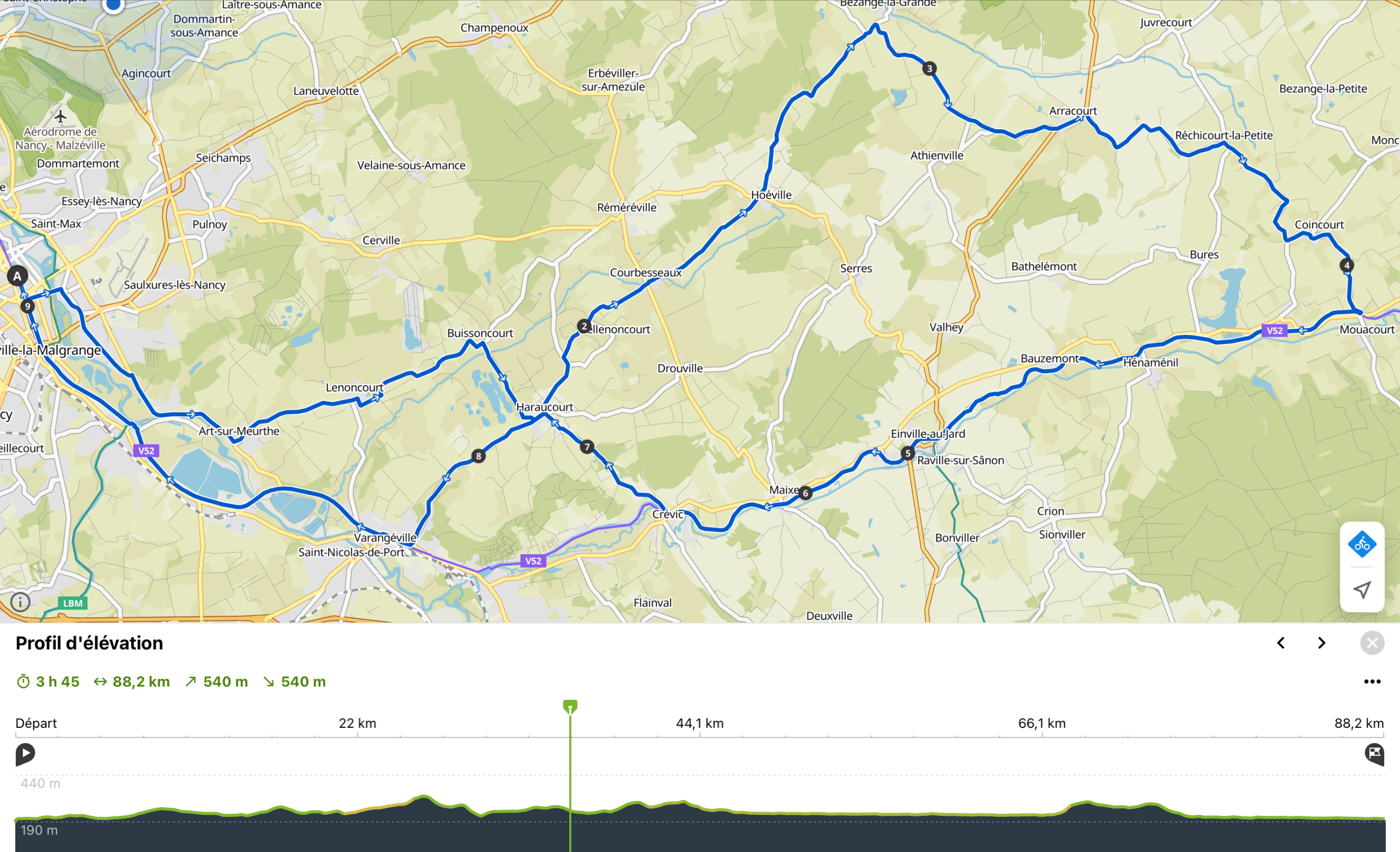 Kinépolis, piste canal, Laneuveville-devant-Nancy (à gauche), M126-M2, Art-sur-Meurthe (à gauche), M126, Lenoncourt, D126, Buissoncourt (à droite), D81, Haraucourt (à gauche et à gauche), D80 (à droite), CC, D80A, Courbesseaux, Hoéville (droite-gauche), C7, Bezange-la-Grande (à droite), D23, Arracourt (à gauche-D914 puis à droite), D23, Réchicourt-la-Petite, D23, Coincourt, D23, Rejoindre D2 et prendre à droite V52,V52 jusqu’à Crévic, Crévic (à gauche), D81, Haraucourt (à gauche), D80, Varangéville à droite puis à gauche V52, Laneuveville-devant-Nancy, piste canal, Kinépolis.
